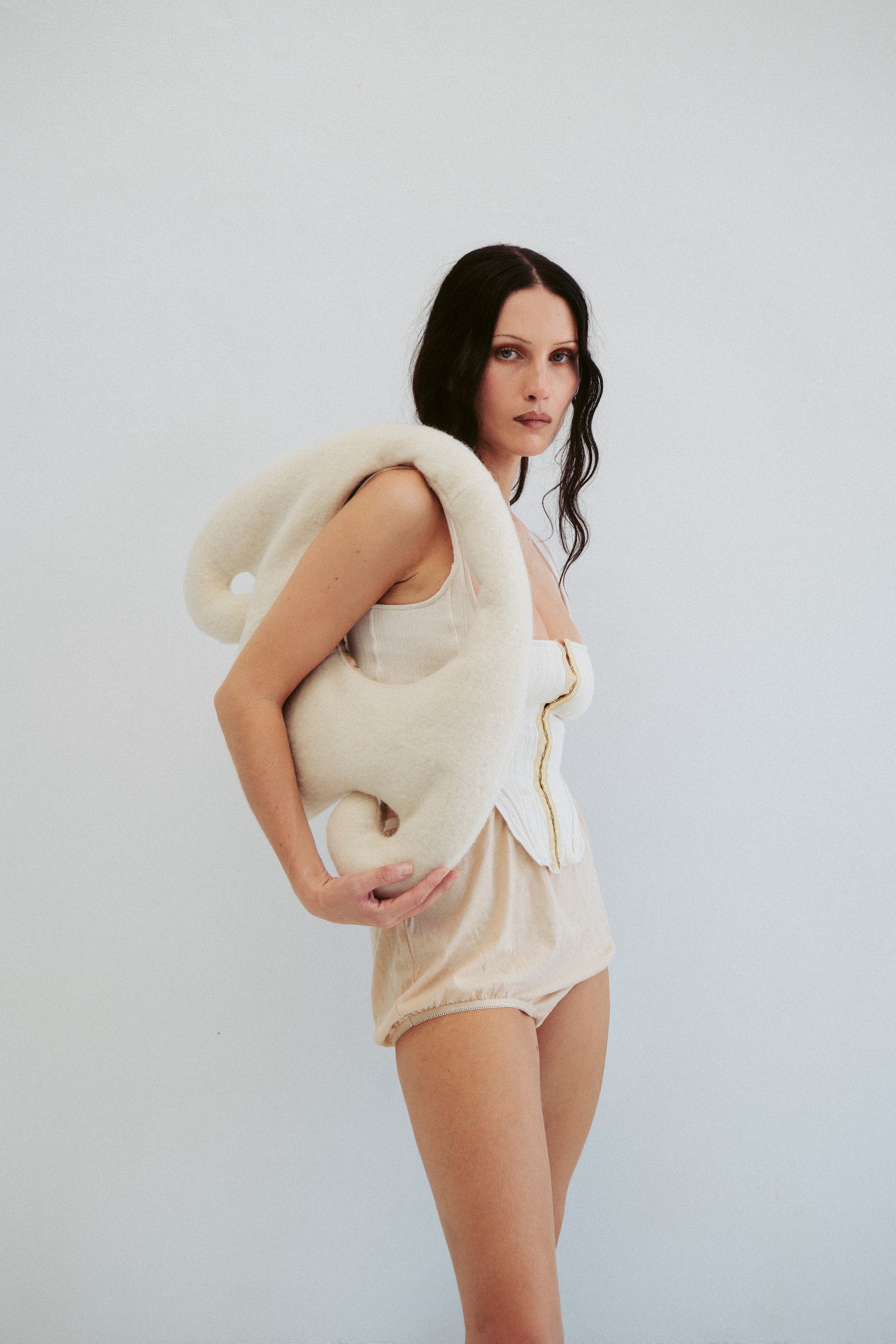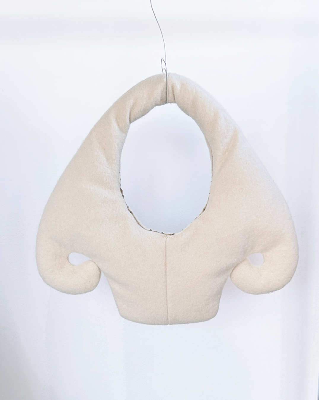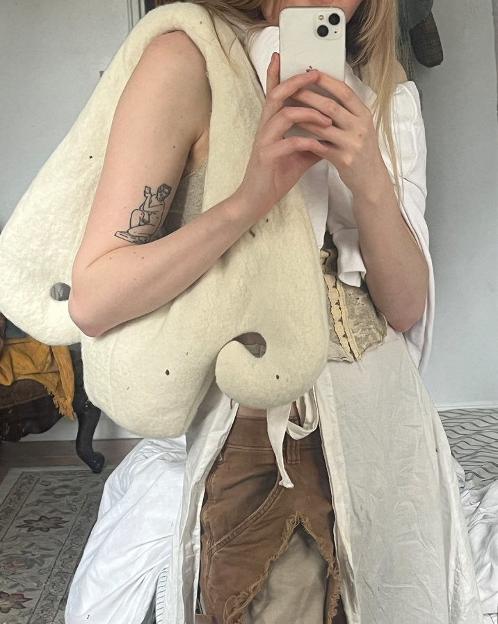 each bag is cut from a vintage boiled wool blanket, lined in linen with hook and eye closures and a light pillow fill.